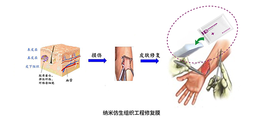 • To address the clinical challenges associated with refractory and complex skin wound repair—particularly in cases such as diabetic skin infections, ulcers, deep tissue damage, and extensive burn or scald injuries requiring skin reconstruction—a nanobionic repair membrane has been designed to closely mimic the composition and structure of human skin tissue. By maximizing the simulation of autologous tissue repair, it provides an optimal environment for cell growth, induces and promotes the proliferation and differentiation of various cell types, thereby accelerating the healing process, filling skin defects, and facilitating tissue regeneration. This approach overcomes the limitations of autografts, allografts, and xenografts, while addressing the persistent issues of delayed wound healing and recurrent infections. It offers a safe and reliable solution for the field of skin regeneration. The product series is currently in the preclinical development stage.